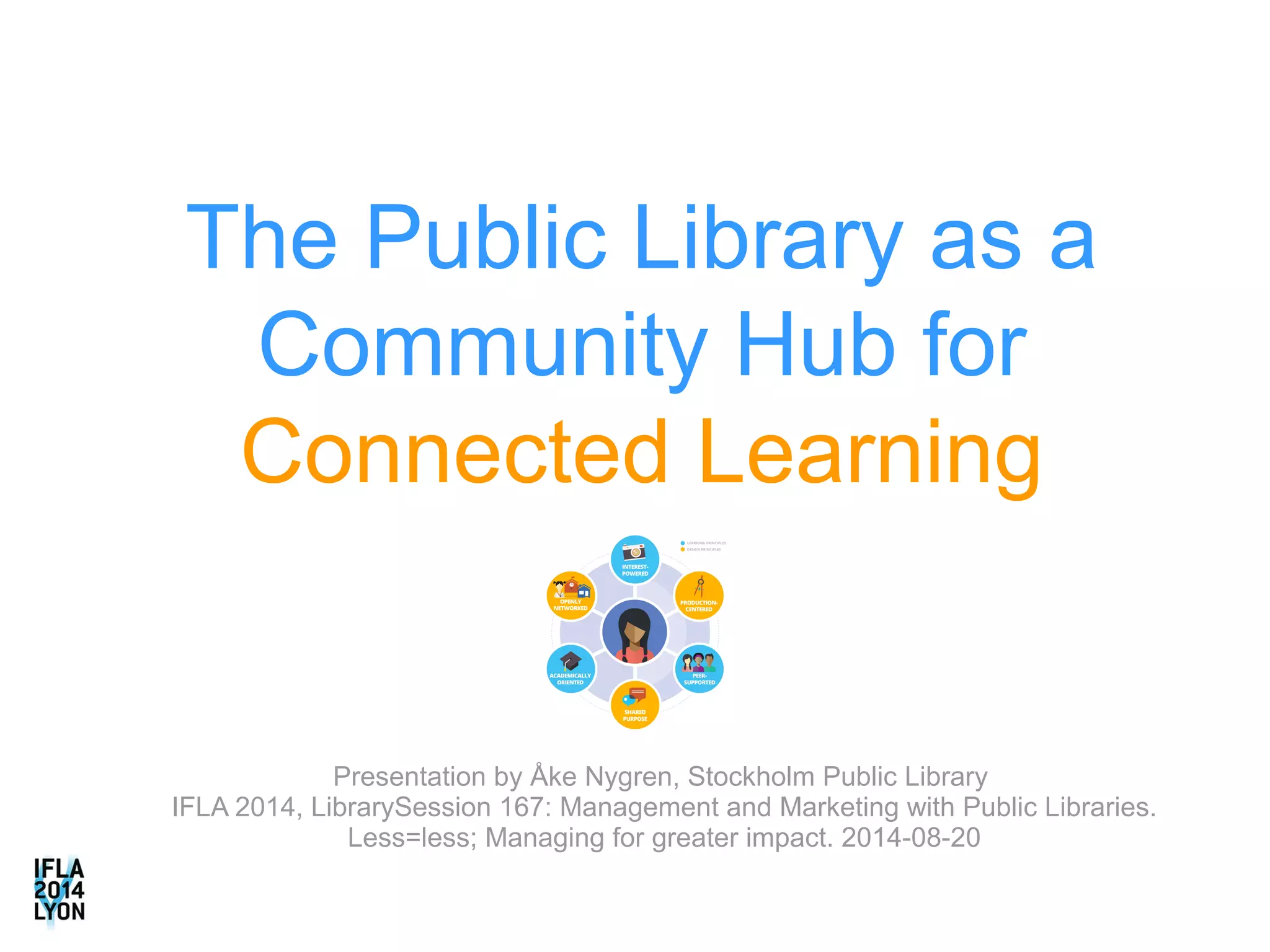 Åke Nygren's presentation highlights the role of public libraries as community hubs for connected learning, emphasizing the need to support digital literacy and bridge the digital divide. Libraries should engage with local communities through events and collaboration with schools and other organizations to enhance learning experiences. The presentation advocates for a shift towards ownership of the internet, encouraging individuals to create and solve problems rather than just consume content.