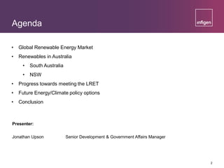 This document provides an overview of renewable energy in Australia, with a focus on developments in South Australia and New South Wales. It discusses the growth of the global and Australian renewable energy markets. It notes that South Australia has seen renewable energy penetration approaching 40% of electricity generation, with accompanying declines in emissions and wholesale electricity prices. It also discusses policy options to facilitate further modernization and decarbonization of Australia's electricity system. The presenter concludes that there is significant momentum worldwide to decarbonize electricity, and that higher levels of renewable energy can be reliably achieved in Australia through emerging technologies.