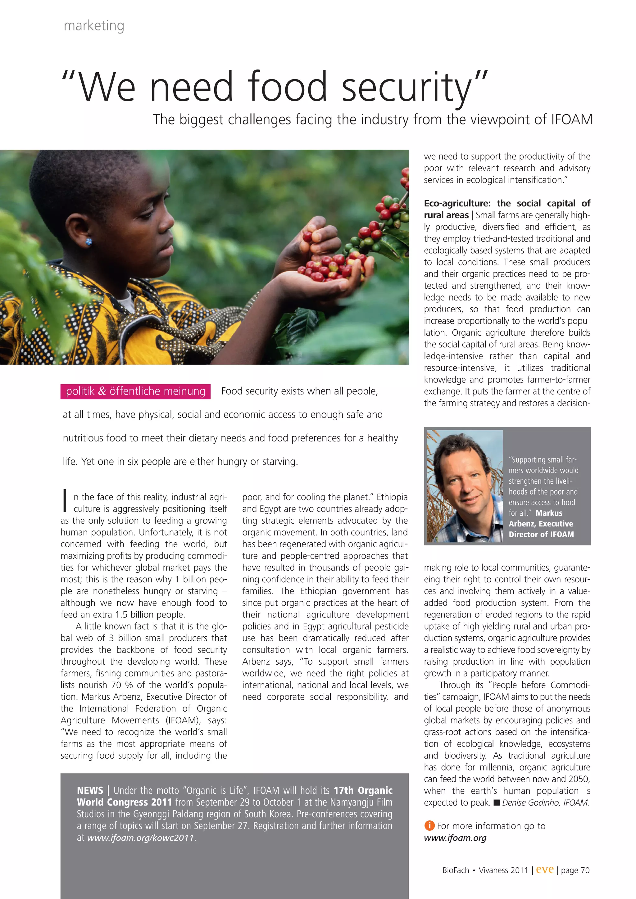 The document discusses the views of IFOAM (International Federation of Organic Agriculture Movements) on challenges facing the agricultural industry. IFOAM believes that small farmers are key to global food security as they currently provide for 70% of the world's population. However, industrial agriculture prioritizes profit over feeding people. IFOAM advocates for policies, social responsibility, and research to support small farmers' productivity and allow organic practices to increase food production proportionally with population growth through 2050.