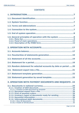 The document provides a user manual for the iFOBS interactive front-office banking system. It describes the system's functions, terms, and general principles for connecting and operating within the system. The manual outlines the menu bar options for registration, viewing panels and forms, making payments and statements, and accessing reference books and templates. It also provides guidance for ending a user session and connecting to or synchronizing with the bank.