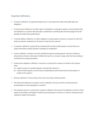 This document provides an overview and summary of key aspects of IFRS 15 - Revenue from Contracts with Customers. It defines important terms, outlines the scope of IFRS 15, and discusses principal vs agent considerations, repurchase agreements, and the 5 steps for recognizing revenue under IFRS 15: 1) identify the contract with a customer, 2) identify the performance obligations, 3) determine the transaction price, 4) allocate the transaction price to the performance obligations, and 5) determine when to recognize revenue. It also covers contract modifications, licensing agreements, and contract costs.
