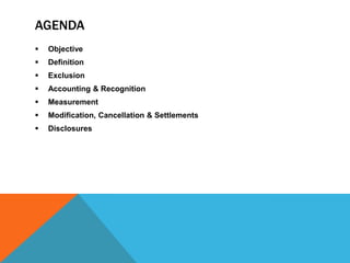 This document provides an overview of IFRS 2 Share-based Payment. It defines share-based payment transactions as transactions where an entity receives goods or services from a supplier in exchange for equity instruments or a cash-settled transaction based on equity values. Key aspects covered include measurement of equity and cash-settled transactions, treatment of vesting and performance conditions, accounting for modifications, cancellations, and settlements, and disclosure requirements.