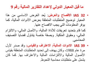 معيار IFRS 9 يهدف إلى توضيح متطلبات عرض الأدوات المالية والإفصاح عنها، ويشمل إعادة تصنيف IAS 39 عبر ثلاث مراحل: التصنيف والقياس، والاكتساب، ومحاسبة التحوط. تم تحديد تصنيفات للأصول المالية، بما في ذلك القيمة العادلة والتكلفة المستهلكة، وتحديد العقود الضامنة كعقود مالية. هذا المعيار يسعى لتقديم معلومات مفيدة لمستخدمي البيانات المالية لتقييم التدفقات النقدية المحتملة.