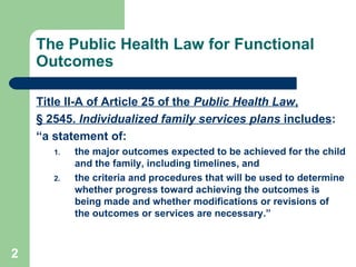 1) Functional outcomes in an Individualized Family Service Plan (IFSP) describe what skills a child needs to participate in daily routines and activities with their family.
