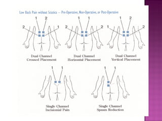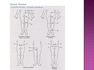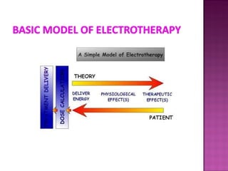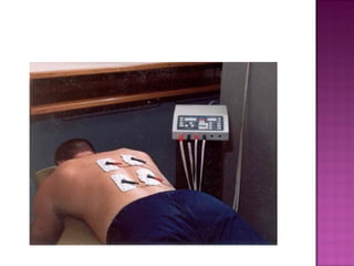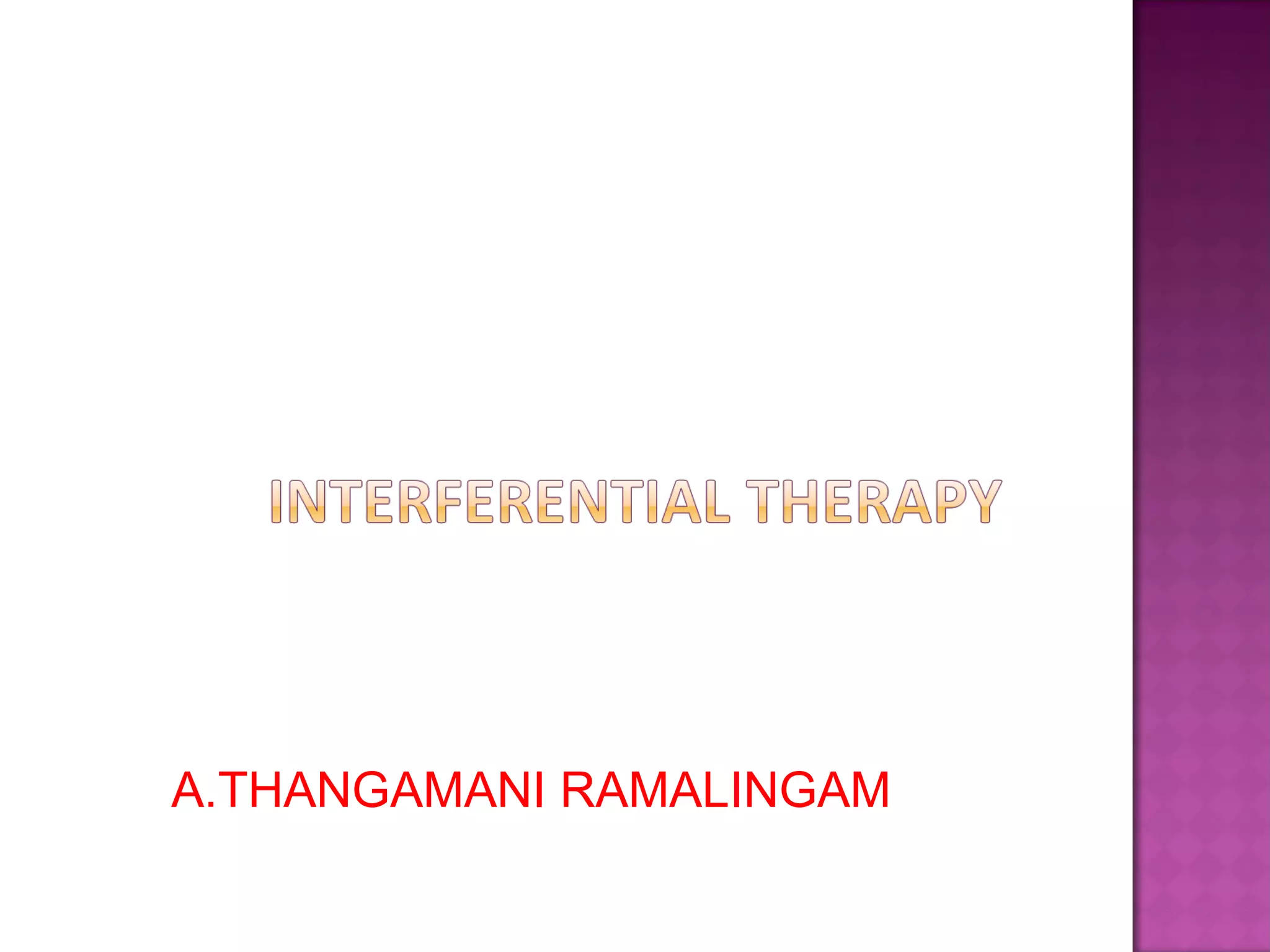 This document provides information on interferential therapy (IFT), including its history, principles, applications, and treatment protocols. It discusses how IFT works by producing an interference current within the body using two medium frequency currents of slightly differing frequencies. IFT is used to reduce pain and muscle spasm, promote tissue healing, and reduce edema. Common treatment parameters and applications are outlined, along with contraindications and potential dangers of IFT. The document also describes the proper procedure for administering IFT treatments.