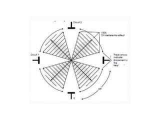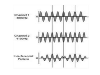 Interferential therapy involves applying two medium frequency alternating currents intersecting in the body to produce a low frequency interference current. This current is able to penetrate deeper into tissues than direct current, allowing for pain relief and muscle stimulation. The interference current is modulated to create a beat frequency effect. Different electrode types and application methods exist to target specific areas. Physiological effects include reducing pain, increasing blood flow and muscle stimulation. Treatment parameters like frequency, duration and method of application are chosen based on the condition and treatment goals.