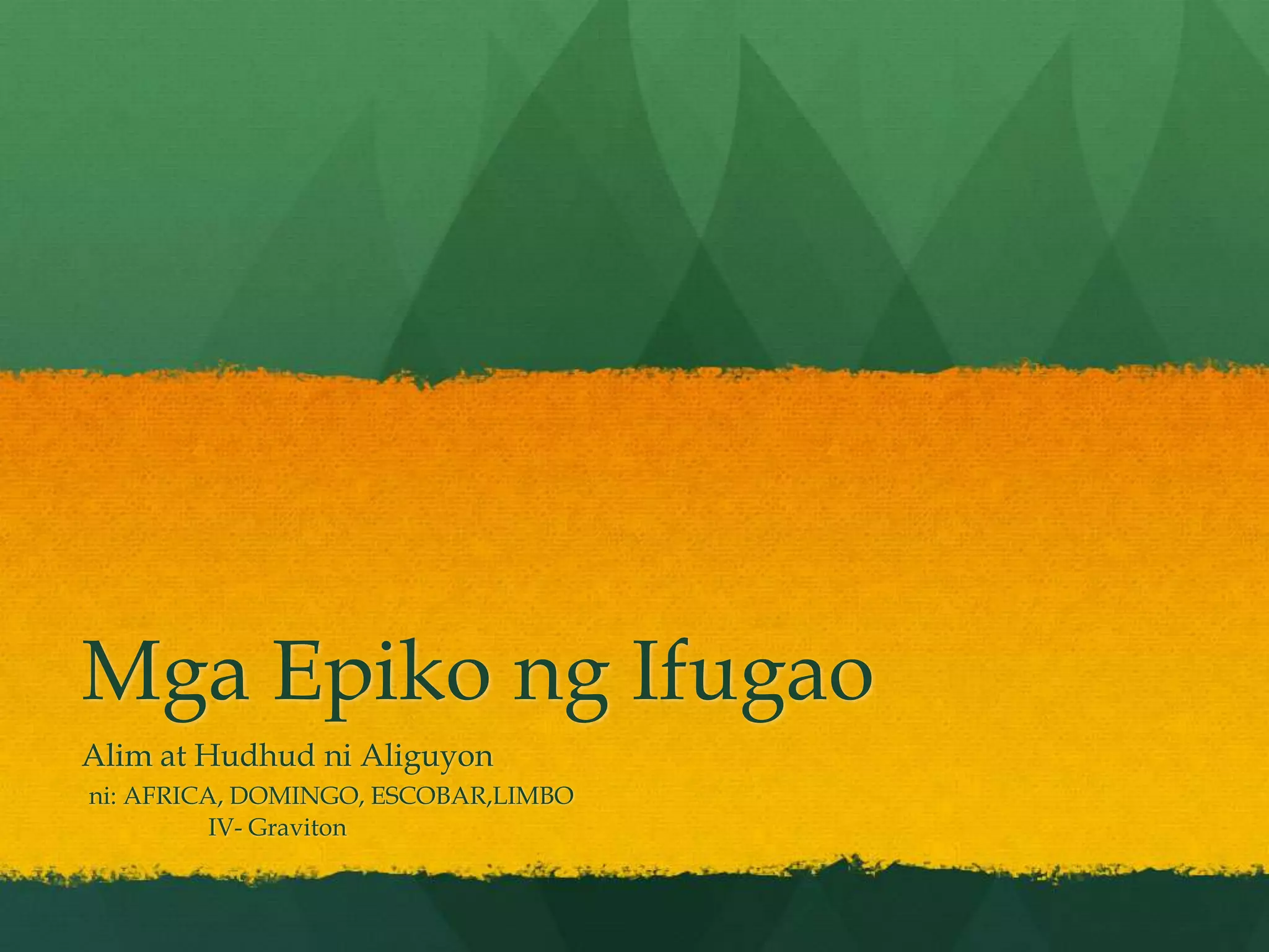 Ang mga epiko ng Ifugao, tulad ng Alim at Hudhud ni Aliguyon, ay nagbibigay ng pananaw sa kultura, relihiyon, at mga ritwal ng mga Ifugao. Ang mga kwento ay tungkol sa mga tao at diyos, kung saan ang mga karakter ay sumasailalim sa mga pagsubok, laban para sa kapangyarihan, at pagsasakripisyo para sa mas mataas na layunin. Itinuturo rin ng mga epiko ang kahalagahan ng mga batas panlipunan at ang impluwensya ng mga diyos sa araw-araw na buhay ng mga Ifugao.