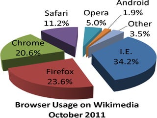 A web browser is a software application used to access information on the World Wide Web. The first browser was created in 1991 by Tim Berners-Lee and was called WorldWideWeb. Popular modern browsers include Google Chrome, Mozilla Firefox, Apple Safari, Microsoft Internet Explorer, and Opera. Each browser has its own features, interface, and engine for rendering web pages. Security and privacy are important considerations when choosing a browser.