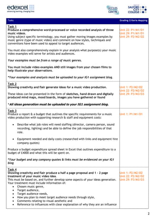 This assignment brief outlines tasks for students to complete research and pre-production work for a music video. It includes 5 tasks: 1) Analyzing 3 existing music videos and commenting on their styles, techniques and target audiences; 2) Generating ideas for an original music video; 3) Producing a budget and staffing plan; 4) Writing a proposal and treatment; and 5) Drafting a script. The assignment aims to develop students' technical analysis, idea generation, research, and script writing skills for music video production. It will assess learners' understanding of how conventions appeal to audiences and require detailed planning documentation.