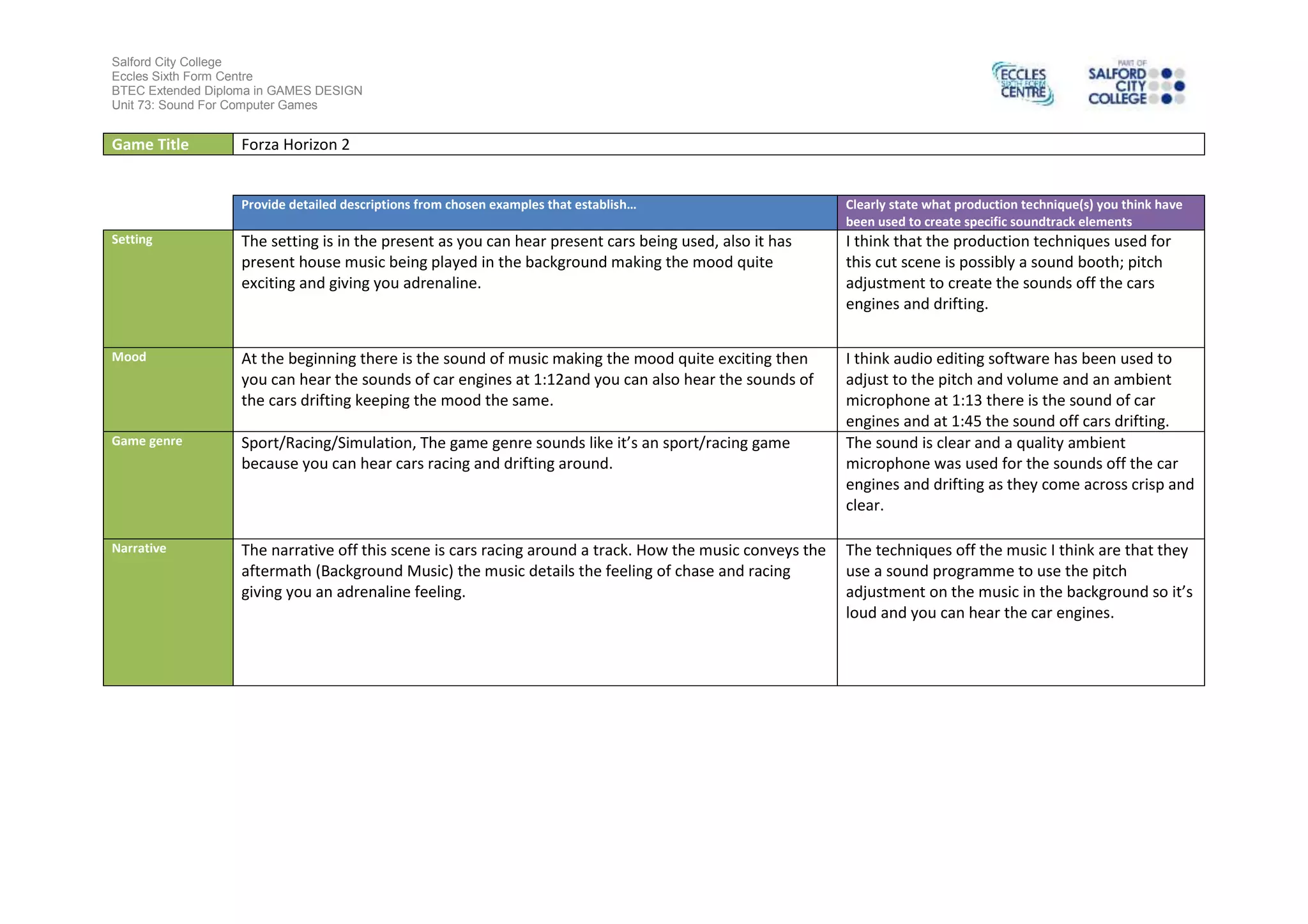 This document provides an analysis of the soundtrack for the video game Forza Horizon 2. It describes the setting as presenting cars and house music to create an exciting, adrenaline-filled mood. Specific production techniques are identified, including the use of a sound booth and pitch adjustment to create engine and drifting sounds. Audio editing software is noted as adjusting pitch and volume, with an ambient microphone capturing clear engine and drifting sounds. The game genre is identified as sport/racing/simulation based on the sounds of cars racing and drifting. Narrative and music are described as conveying the feeling of chase and racing through adrenaline.
