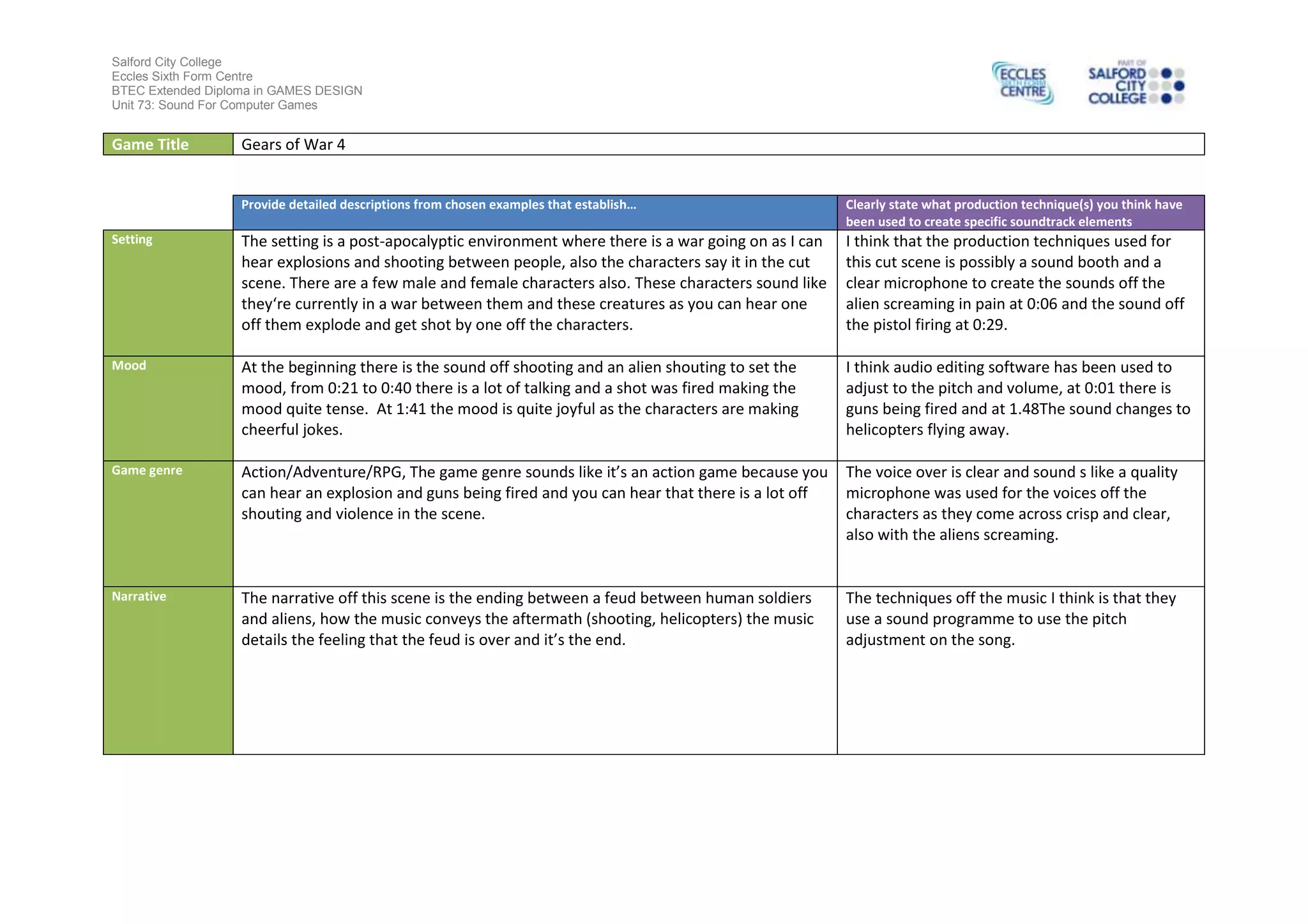 The document discusses the soundtrack elements of the game Gears of War 4. It analyzes the setting, mood, genre, and narrative conveyed by the soundtrack. For each element, production techniques used are identified, such as using a sound booth and clear microphone for alien sounds and gunshots, and audio editing software to adjust pitch and volume of different soundtrack elements.