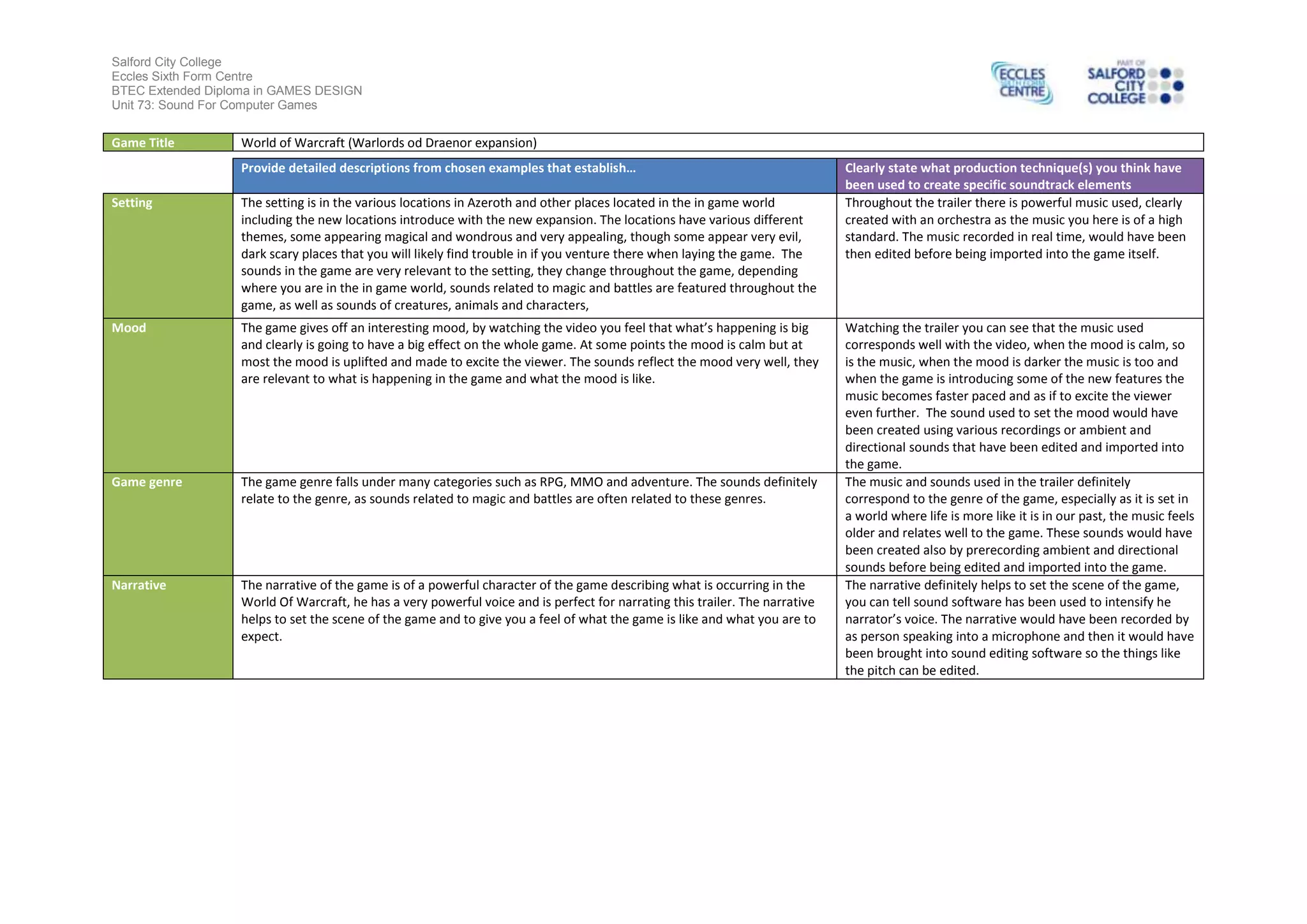 World of Warcraft: Warlords of Draenor expansion. The setting includes various locations in Azeroth and other in-game worlds, with themes that range from magical to dark and scary. The sounds match the settings. The mood conveyed in the video ranges from calm to exciting, with the sounds reflecting the mood. The game genre includes RPG, MMO and adventure, with sounds related to magic and battles. The narrative is told by a powerful character describing events in the World of Warcraft to set the scene and expectations for the game.