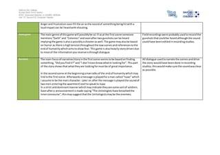 The document analyzes sound design elements in the first two scenes of the game DeadSpace 3. In the first scene, field recordings of winds and snow were likely used to establish an isolated, arctic setting. In the second scene, vehicle sounds imply an indoor location in a city. Music and dialogue were used to create moods of confusion, loneliness, tension, anger and frustration. The game genre is described as a sci-fi shooter with horror elements, driven by a narrative focused on finding something important to humanity's survival. Field recordings and studio recordings were used for sound effects and dialogue to advance the plot.