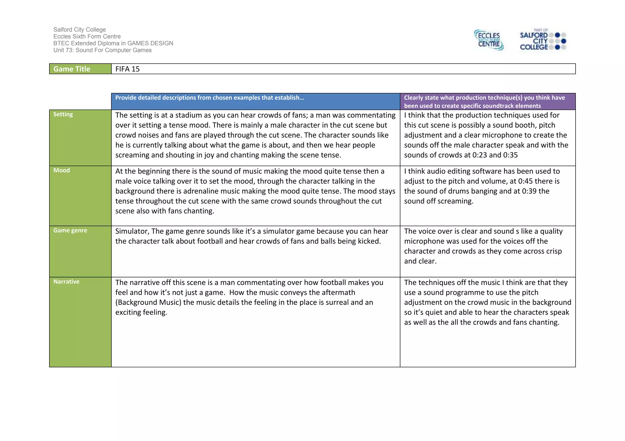 The document provides descriptions and analysis of sound elements in a FIFA 15 game cut scene. It analyzes the setting, mood, game genre, and narrative conveyed by the sounds. For the setting, crowd noises and chants set a tense atmosphere. Adrenaline music maintains a tense mood throughout. The sounds establish the game genre as a soccer simulator through commentary and crowd noises. Production techniques identified include a sound booth for recording voices, audio editing software to adjust pitch and volume of different elements, and a quality microphone.