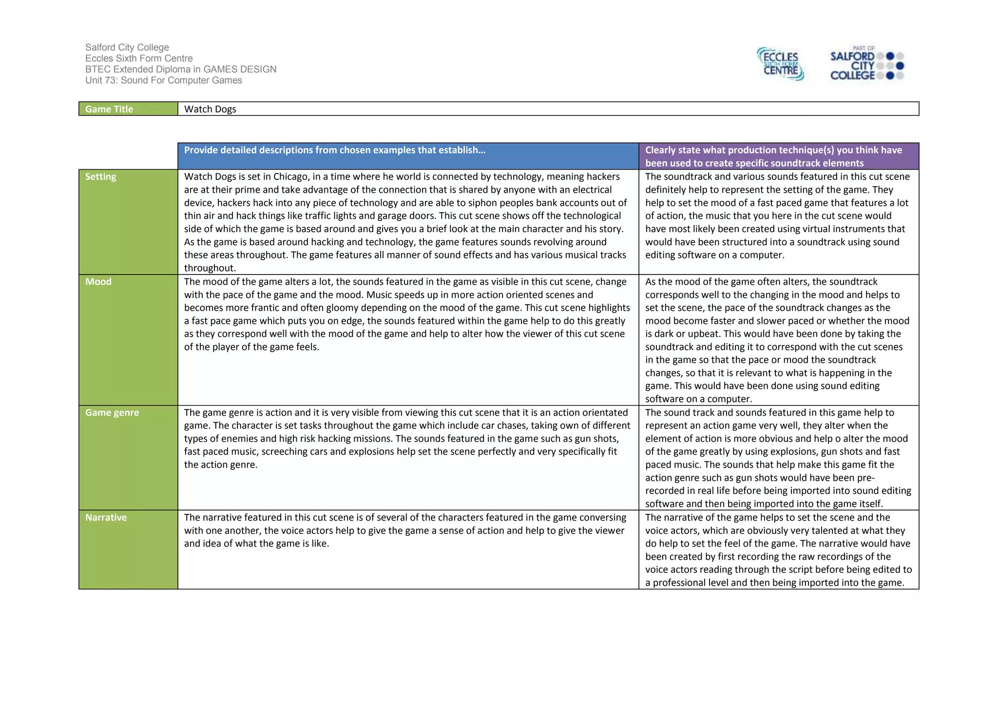 The document provides an analysis of the sound design and soundtrack of the video game Watch Dogs. It examines how the sounds establish the setting of a technologically advanced Chicago and represent the game's genres of action. The mood and pace of the soundtrack changes to correspond with the changing moods in the game, such as faster music during action scenes, which was achieved through sound editing software. Effects like gunshots were prerecorded and imported into the game to help portray the action genre. The voice acting in cutscenes helps set the tone and narrative of the game by giving a sense of the characters and story.