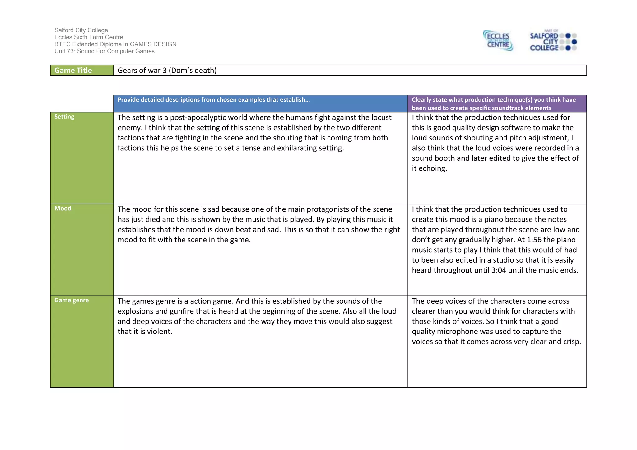 This document analyzes the sound design techniques used in a scene from the video game Gears of War 3. It discusses the setting, mood, game genre, and narrative established by the sounds. For each element, it describes what is heard in the scene and the production techniques likely used to create the soundtrack elements, such as using a piano to set the sad mood, recording voices in a sound booth, and editing music to play louder than other sounds.