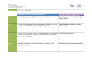 The soundtrack for the game Ghost Recon: Future Soldier establishes a snowy setting through digitally produced snowstorm sounds. Voice actors were recorded having cheerful conversations and laughing to set a mood of levity, despite references to military codes. Various voice actors were recorded having conversations to advance the narrative and imply multiple characters amid the snowstorm sounds.