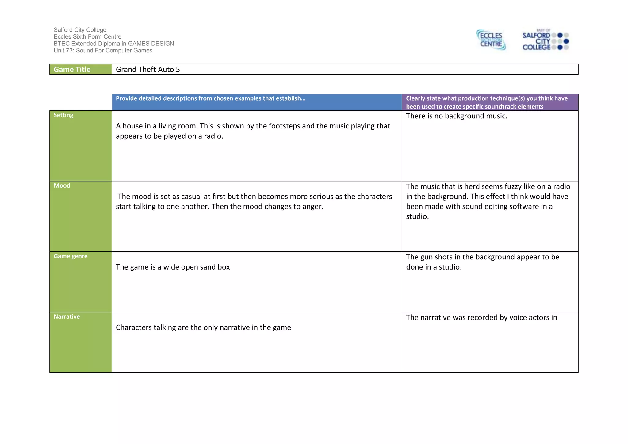 The document provides an analysis of the sound design techniques used in the video game Grand Theft Auto 5. It describes the setting as a living room shown through footsteps and radio music. The mood shifts from casual to serious to angry as characters talk. Background music is absent but gunshots and voices appear recorded in a studio then edited with software to achieve effects like the fuzzy radio sound.