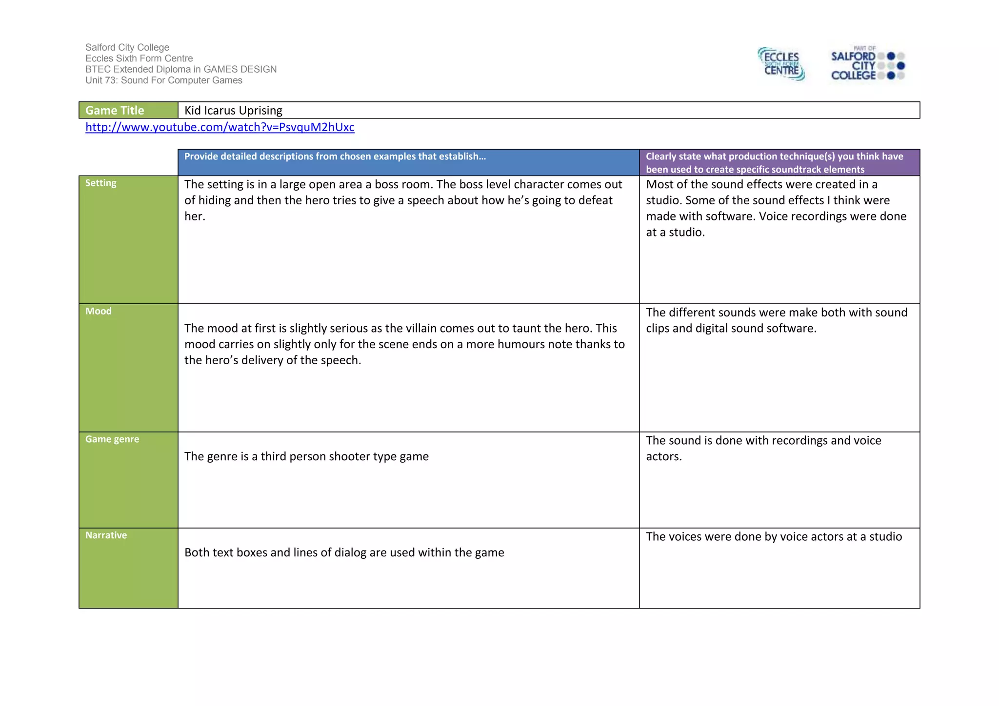 The document summarizes sound elements from the game Kid Icarus Uprising. It analyzes the setting, mood, genre, and narrative of a boss battle scene. For each element, it states that different production techniques were used to create the sounds, including recording sound effects and voices in a studio and using digital sound software. The genres is described as a third-person shooter, and both text boxes and voice actors were used to convey the narrative.
