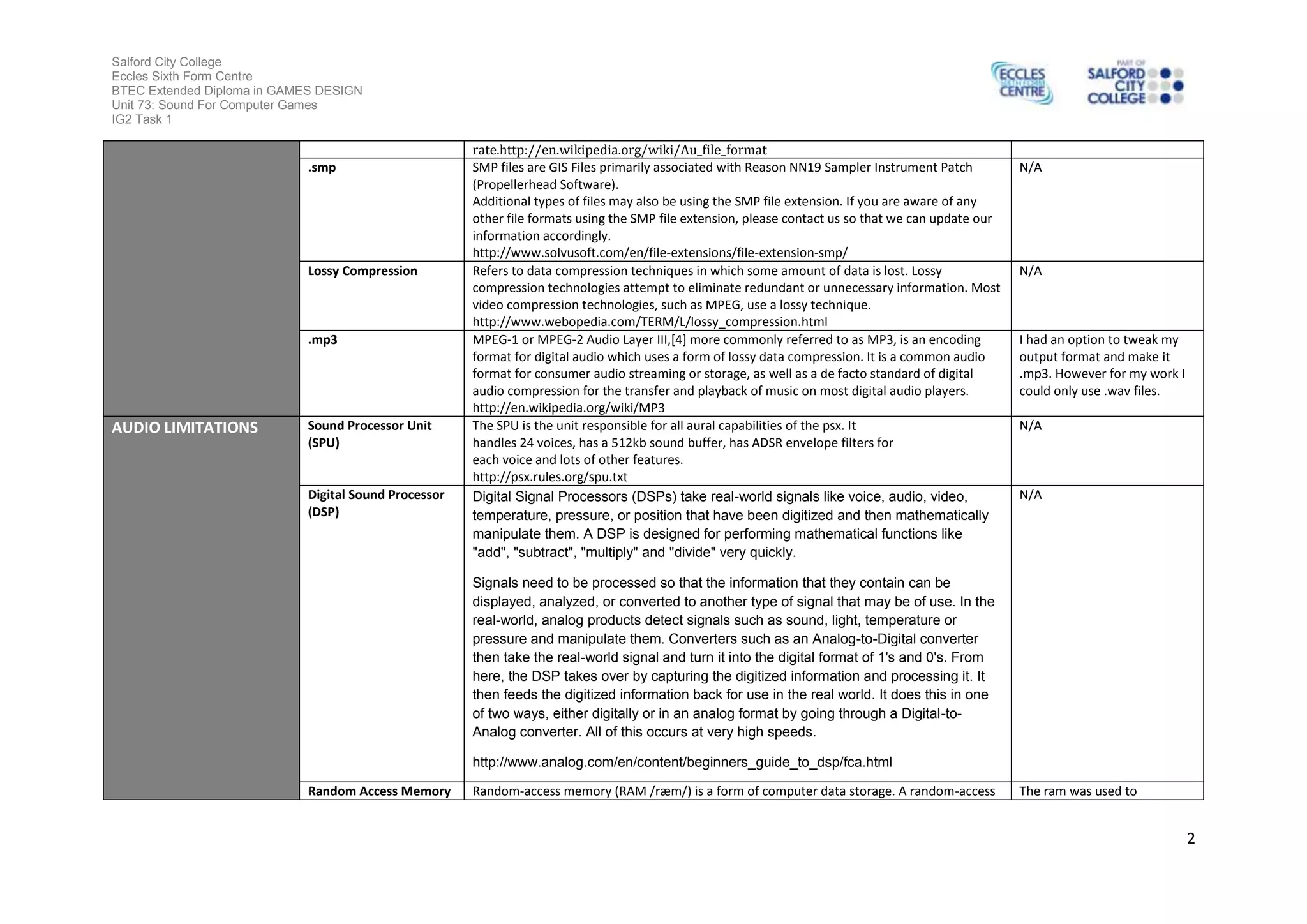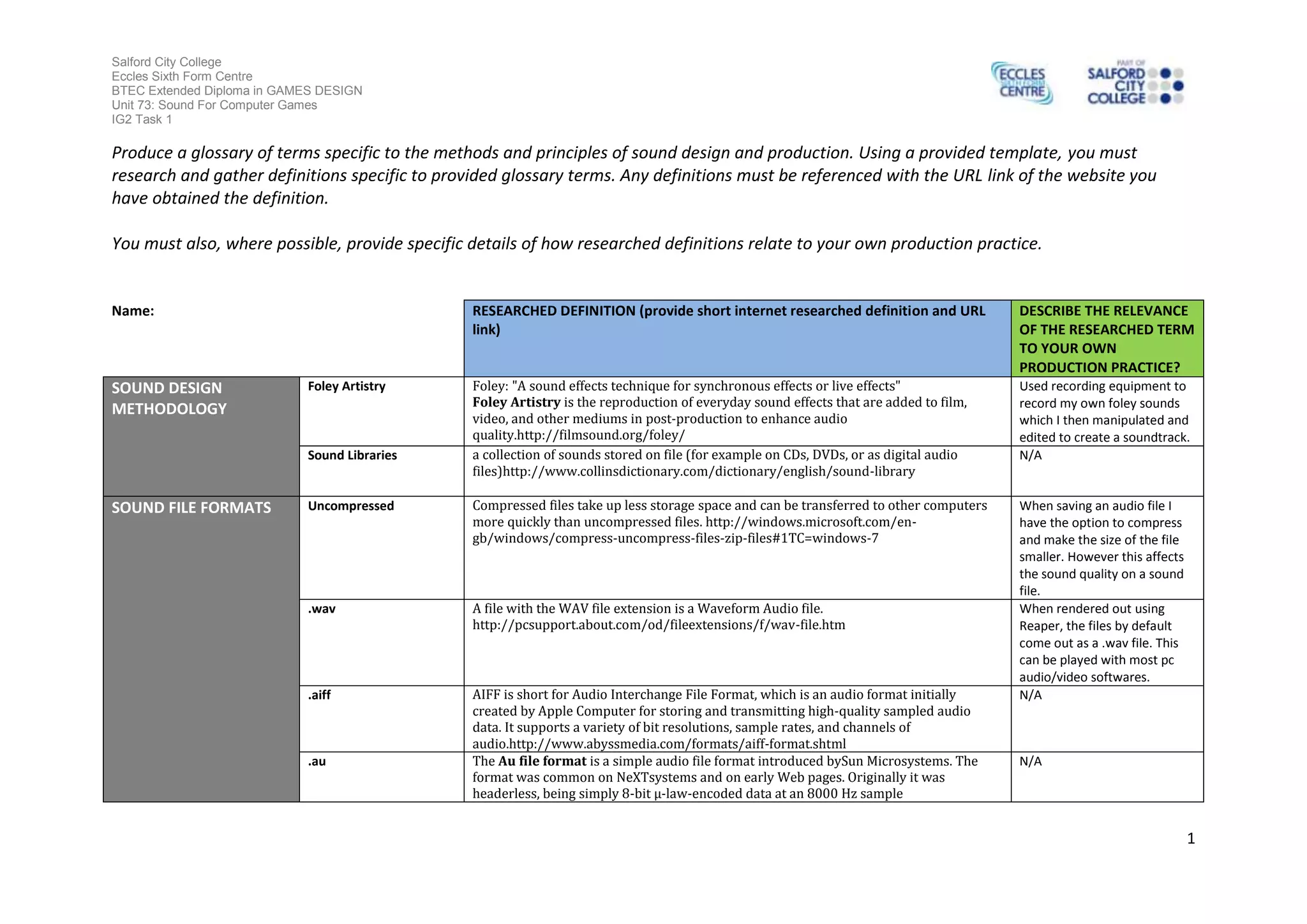 The document is a glossary assignment for a games design course requiring research and definitions of audio terms related to sound design and production. It includes over 20 terms defined with URLs for supporting information. For many terms, the student also provides details on how the term relates to their own production work, such as using MIDI keyboards and software to create and edit soundtracks, and having the option to output audio files in different formats like .wav and .mp3.