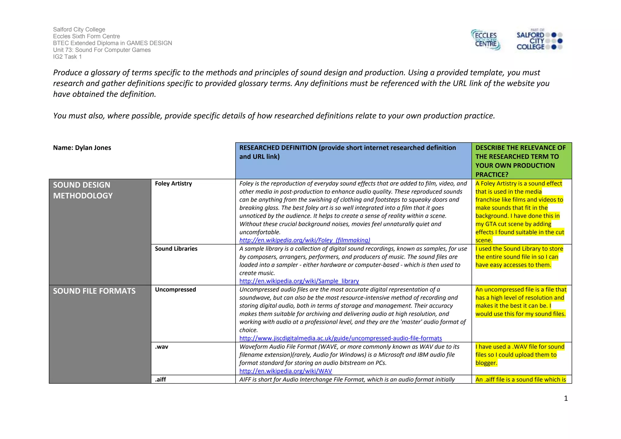 This document provides definitions for sound design and production terms as part of a unit on sound for computer games. It includes a glossary with over 20 terms defined, including foley artistry, sound libraries, audio file formats like .wav and .aiff, lossy compression, audio cards, mono and stereo audio, and analogue recording. For each term, the student provided a short definition from an online source as well as their own thoughts on how the term relates to their production practice.