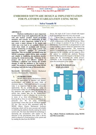 The document discusses the design and implementation of an automated platform stabilization system using MEMS technology and microcontrollers, emphasizing its importance in preventing accidents in large-scale applications. It details the use of an accelerometer to measure displacement and how a microcontroller responds to changes by driving motors to maintain stability. The project aims to create a cost-effective and reliable solution for stabilizing machinery in various industrial contexts.