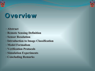 This document presents a new approach for classifying multispectral remote sensing images using weighted pixel statistics. The approach combines spectral signatures from an image to perform accurate classification. Simulation results on synthesized test images show the approach provides more accurate classifications with fewer unclassified zones compared to traditional weighted order statistics methods, demonstrating the efficiency of the proposed approach. Future work is outlined to further evaluate performance.