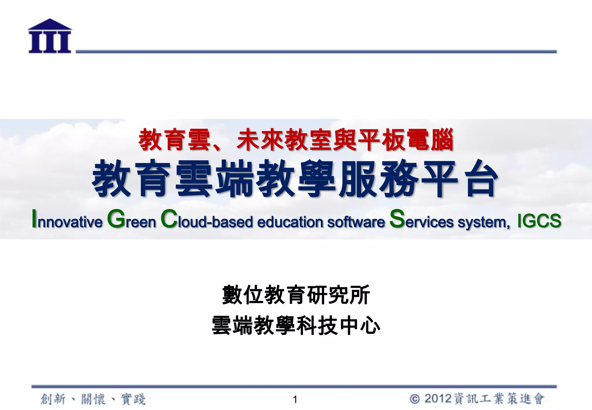 该文档介绍了教育云、未来教室与平板电脑的整体解决方案及其在教学中的应用,强调了云端教学服务平台如何整合数字内容与教学工具,从而提升教育效果。通过案例分析,展示了在民生国中实施的教育云平台如何提高学生的学习成效,尤其在英语单词和语法的学习上相比于传统教学模式有显著进步。文档还提及该平台在国际和国内获得的多项奖项,反映其在教育科技领域的影响力。