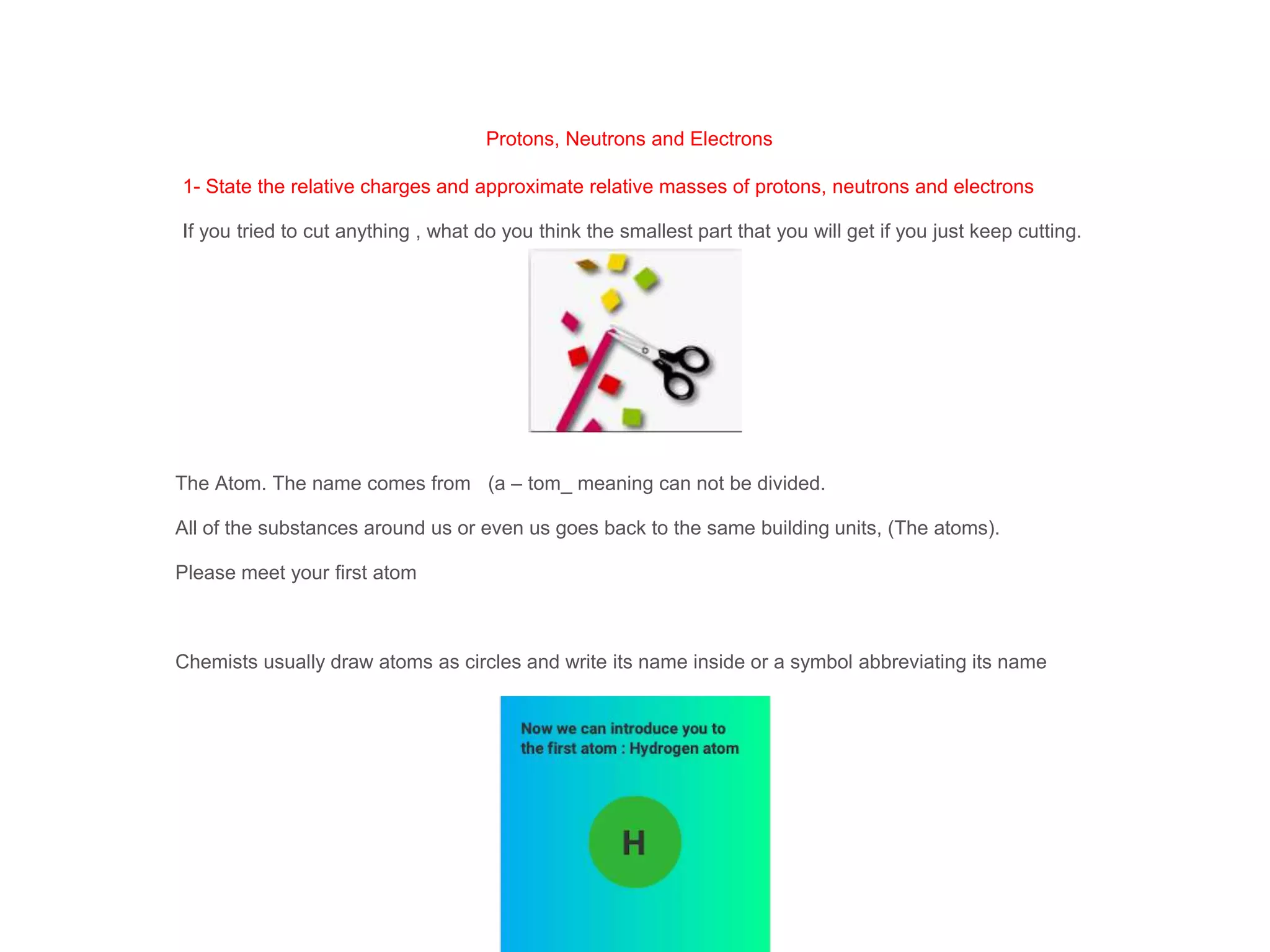 The document discusses the structure and composition of atoms, stating that atoms are the fundamental building units of matter and cannot be divided. It explains that atoms consist of a positively charged nucleus, made up of protons and neutrons, and surrounding electrons that are negatively charged. The overall charge of an atom is neutral due to the balance between the positive charge of the nucleus and the negative charge of the electrons.