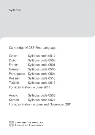 This document provides information about Cambridge IGCSE First Language syllabuses, including aims and assessment objectives, exam structure and availability, curriculum content, and grade descriptions. The exams consist of two papers testing reading comprehension and writing skills. Paper 1 includes short-answer and summary questions on two passages. Paper 2 requires two compositions of 350-500 words each on argument/discussion and description/narration topics. The curriculum aims to develop students' reading, writing, and language abilities, with higher grades requiring more sophisticated analysis and expression.