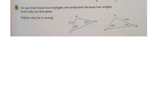This document outlines the concept of congruency in triangles, detailing four key conditions under which triangles can be considered congruent: SSS (side-side-side), SAS (side-angle-side), ASA (angle-side-angle), and RHS (right angle-hypotenuse-side). It provides examples and activities to illustrate these conditions and their applications in proving triangles' congruency. Additionally, it includes exercises for students to practice identifying congruent triangles and applying the rules discussed.