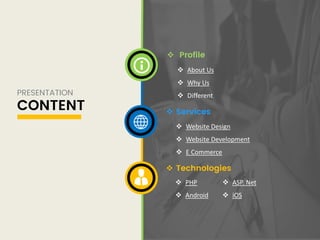 The business presentation summarizes the services, technologies, and process flow of iGex Solutions, an emerging technology services provider based in Ahmedabad, India. The presentation covers their website design, development, and e-commerce services. It highlights their capabilities in PHP, Android, and ASP.Net development. Testimonials praise iGex Solutions for their commitment to quality, timeline, and assistance. Contact information is provided at the end.