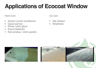 Ecocoat Window by Ominent Sdn Bhd is a premium treatment for various surfaces including sanitary equipment and automotive glass, offering benefits like improved visibility in wet conditions, easy cleaning, and de-icing. The product exhibits hydro- and oleophobic properties, excellent chemical resistance, and durability against weathering. Users are advised to ensure appropriate application and compliance with relevant regulations, with further product information available through the company.