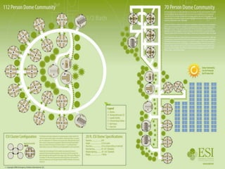The document describes igloo dome structures that can be easily assembled and transported. The 14 and 20 foot domes are made of aerospace composite panels and can be set up by two people in under four hours. When disassembled, the domes pack into a small space like a pickup truck for portable transportation worldwide. They are insulated and finished on the interior to be used as living or working spaces. Production facilities in the US can produce the domes within 1 month, and completed orders can be delivered within 1.5-2.5 months.