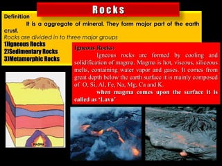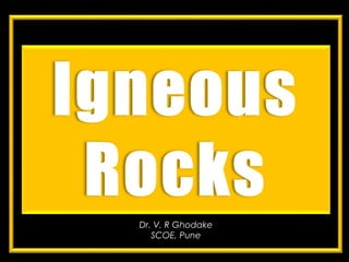 The document provides an extensive overview of igneous rocks, detailing their formation, classification, and characteristics. It categorizes igneous rocks into three major types: igneous, sedimentary, and metamorphic, while discussing the specific classifications within igneous rocks such as extrusive and intrusive types. Key features explored include chemical composition, texture, types of grains, and the various structures such as vesicular and pegmatite structures.