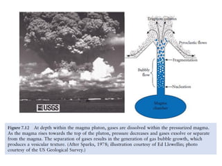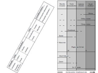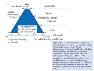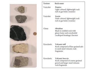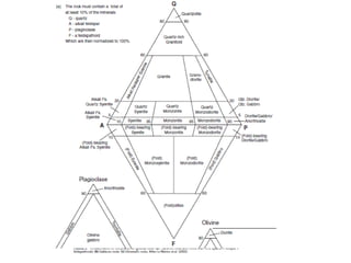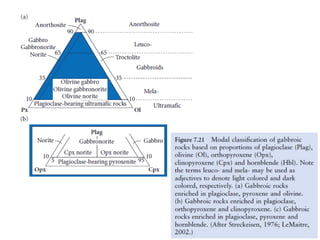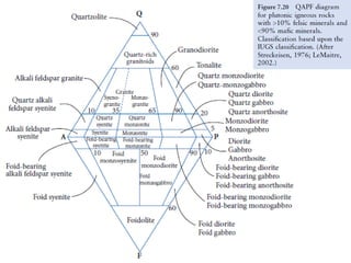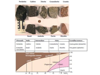 Igneous rocks form from the solidification of magma, either as intrusive (plutonic) rocks from cooling beneath the Earth's surface or extrusive (volcanic) rocks from lava solidifying on the surface. They are classified based on their composition and texture, with key terms including phaneritic, aphanitic, and fragmental, which describe crystal visibility and formation processes. Compositions vary, with major distinctions between felsic and mafic minerals, influencing the physical characteristics and classifications of resulting igneous rocks.