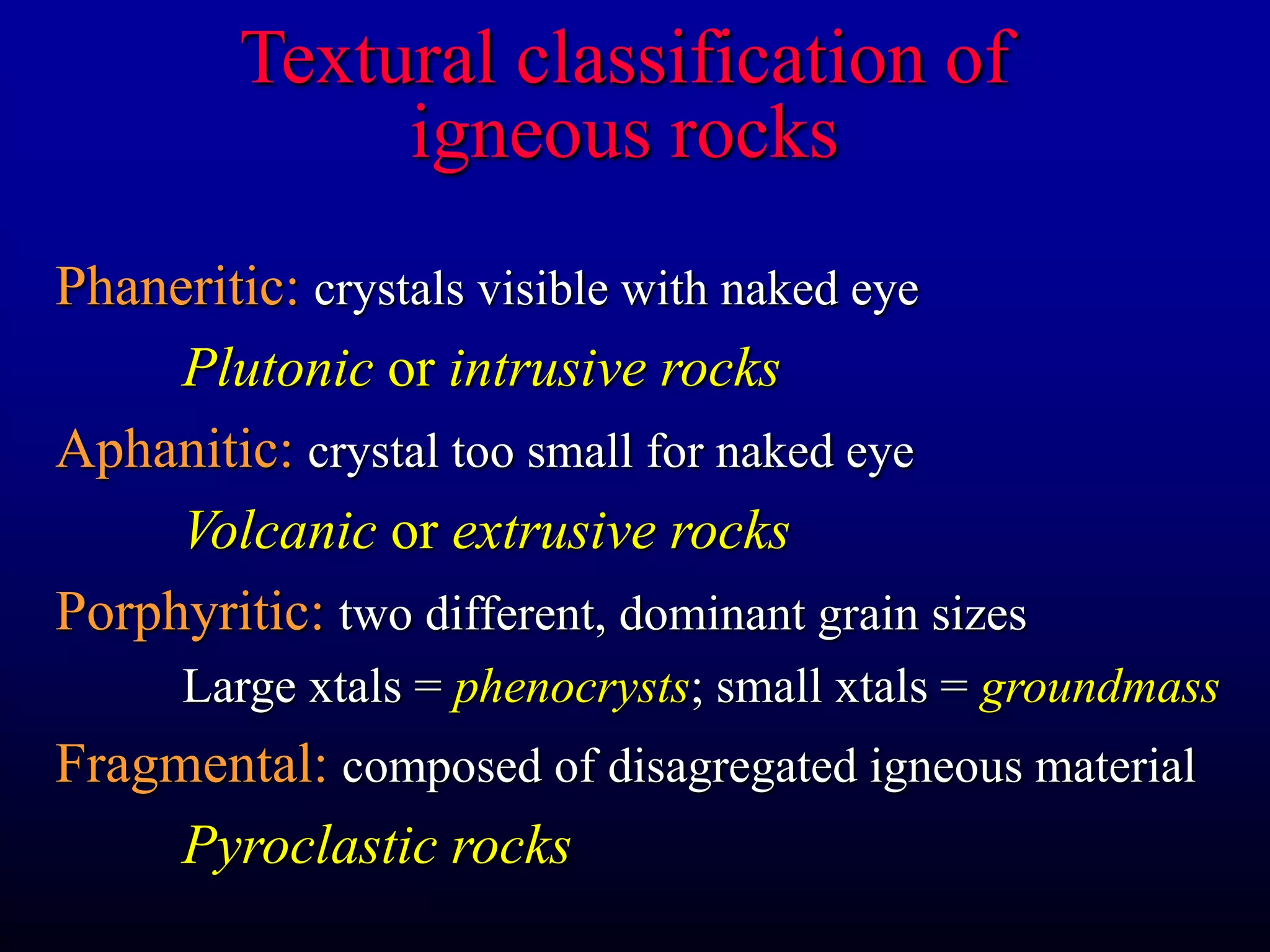 This document describes different textural classifications of igneous rocks based on grain size and composition. It discusses phaneritic rocks, which have visible crystals; aphanitic rocks with crystals too small to see; and porphyritic rocks with two grain sizes. Fragmental rocks are composed of volcanic material. Pegmatitic and glassy textures form from slow and fast cooling respectively. Vesicular textures have gas bubbles. The document also classifies igneous rocks based on their chemical composition and provides diagrams to classify common rock types.
