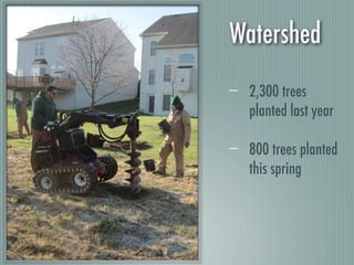 1) Columbia Association has planted over 3,100 trees in the last year and continues rain garden and soil testing programs.