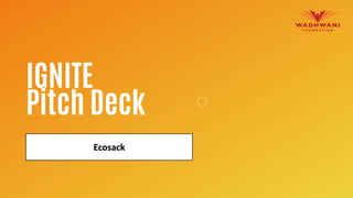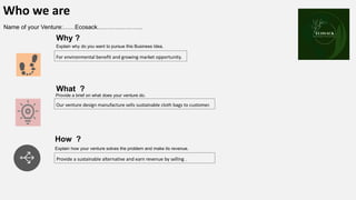 Ecosack designs, manufactures, and sells cloth bags as a sustainable alternative to plastic bags. Their bags are made from recycled cloth waste to benefit the environment and tap into the growing market for reusable bags. Ecosack provides a durable, affordable bag that can help reduce plastic waste by offering customers a reusable option. They validated their minimum viable product by exhibiting bags at a local event and received positive feedback from 70% of over 60 customers surveyed.