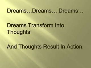This document discusses the need for India to transform into a developed nation through harnessing its human and material resources. It emphasizes igniting human minds through courage and eliminating inferiority complexes. Dreams must transform into thoughts and actions through entrepreneurship, technology, and policy reforms to facilitate this transformation. India should target becoming a top 4 or 5 economy by 2020 by adopting mission mode implementation and minimizing regional divides through rural development. Students must get ready to transform India and think big through igniting their minds.
