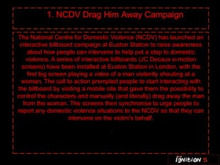 The document highlights various innovative marketing campaigns, including the NCDV's interactive billboard campaign aimed at raising awareness about domestic violence at Euston Station, Stop the Traffik's engaging ads against human trafficking, and unique promotional stunts for the TV show Alcatraz. It also mentions Apple's viral advertising strategy and IKEA's creative approach to promote their bathroom products through an immersive portable toilet experience in Milan. Each campaign utilized engaging visuals and interactive elements to capture public attention and drive action.