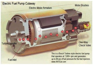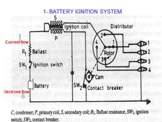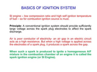 The document discusses ignition systems for spark ignition engines. It describes the basic components and operation of battery ignition systems, magneto ignition systems, and modern electronic ignition systems like transistorized ignition and capacitive discharge ignition. It explains how the ignition system provides a high voltage spark to ignite the fuel-air mixture in the engine cylinders and discusses factors like spark timing, vacuum advance, and centrifugal advance mechanisms that ensure the spark occurs at the optimal time.