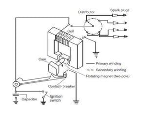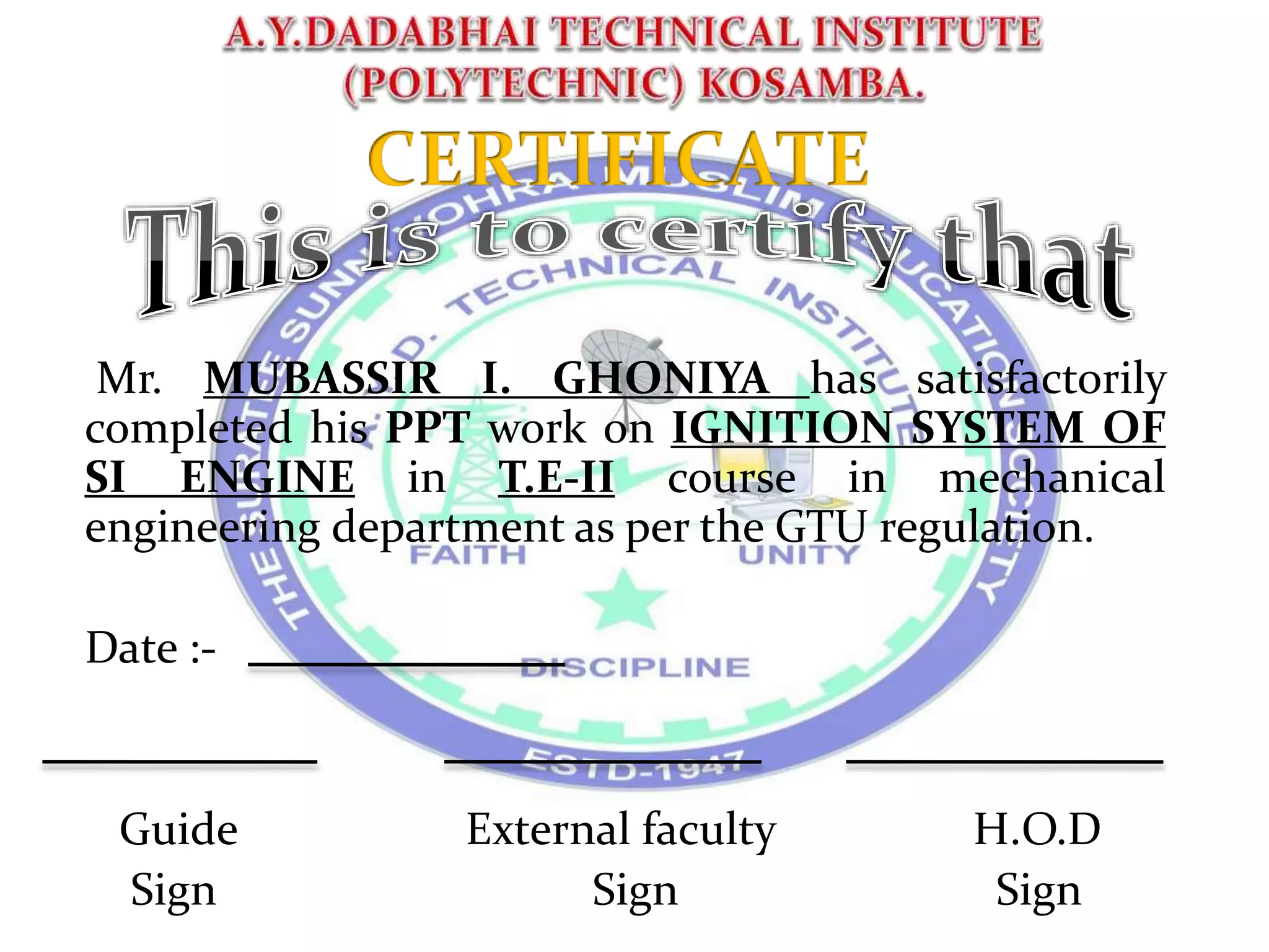 The document summarizes Mr. Mubassir Ghoniya's project on the ignition system of a spark ignition engine. It provides definitions of ignition systems, describes the key components and working of coil, magneto, and electronic ignition systems. It discusses the requirements, advantages, and disadvantages of each system. The firing order in a multi-cylinder engine is also explained briefly.