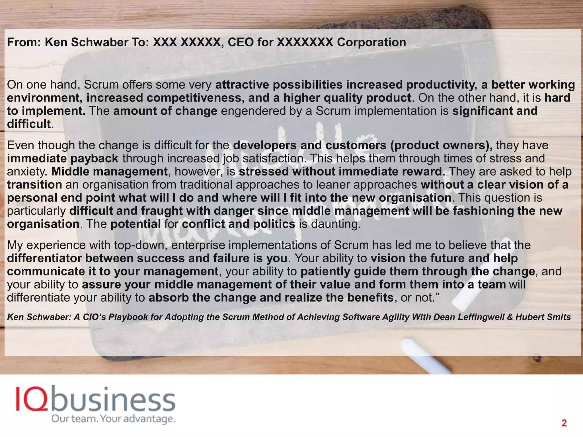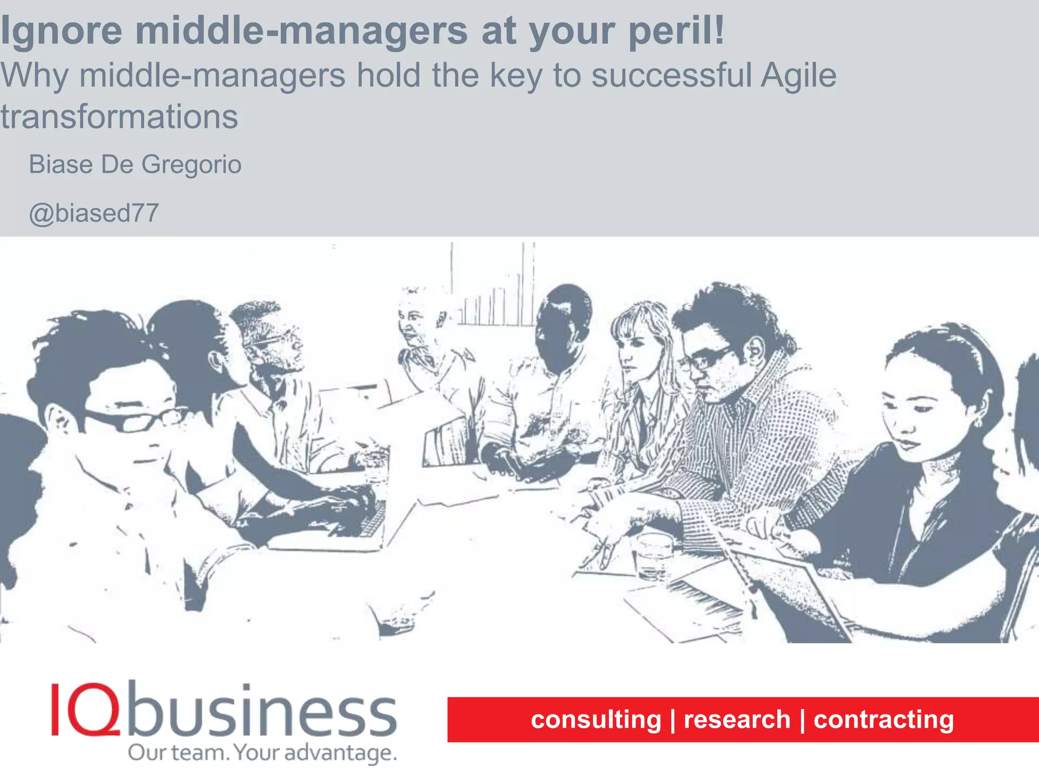 The document discusses the critical role of middle managers in successfully implementing agile transformations, highlighting their stress and resistance due to a lack of immediate rewards and clear vision. It emphasizes that to foster successful changes, leaders must engage, reassure, and effectively communicate with middle management, addressing their concerns and aligning their roles within the new organizational structure. The text outlines several barriers to agile adoption and suggests that effective change management begins at the individual level before scaling to the organization.