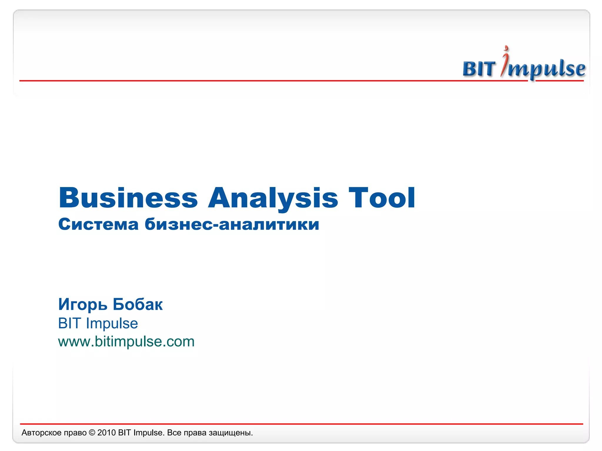 Компания Bit Impulse предлагает систему бизнес-аналитики, включая разработку BI-систем и консалтинг в области OLAP и ETL. Продукты включают BAT® Enterprise для корпоративных пользователей и BAT® Desktop для индивидуальных, с расширенными возможностями анализа данных. Основные направления бизнеса направлены на продажу лицензий и услуги проектирования, с акцентом на поддержку и адаптацию под потребности клиентов.