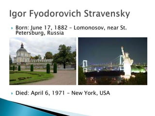 Igor Stravinsky was a renowned 20th century Russian composer who was born in 1882 in Russia and died in 1971 in New York. He wrote extensively in genres including opera, ballet, vocal/instrumental pieces and was highly influential in pioneering modernist styles. Stravinsky studied at St. Petersburg University and worked closely with impresario Sergei Diaghilev, producing famous ballets like The Firebird, Petrushka and The Rite of Spring.