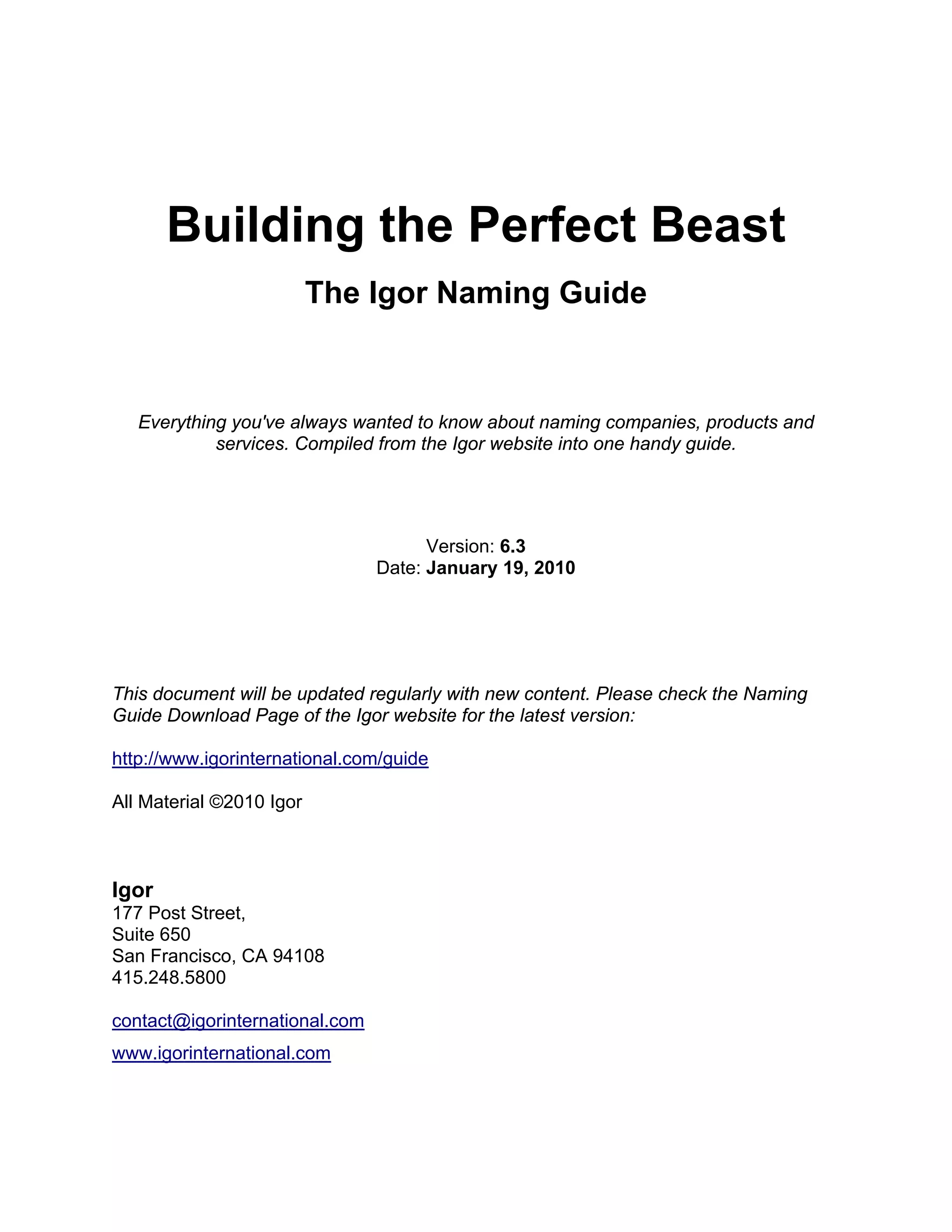 This document provides an overview and guidelines for Igor International's six-step process for developing powerful product and company names. The six steps include: 1) competitive analysis, 2) positioning, 3) name/brand development, 4) trademark prescreening, 5) creative/testing, and 6) finalizing the name and tagline. For each step, key aspects of Igor's approach are described, with the overall goal of creating a name that supports the brand positioning and provides strategic marketing advantages over competitors.