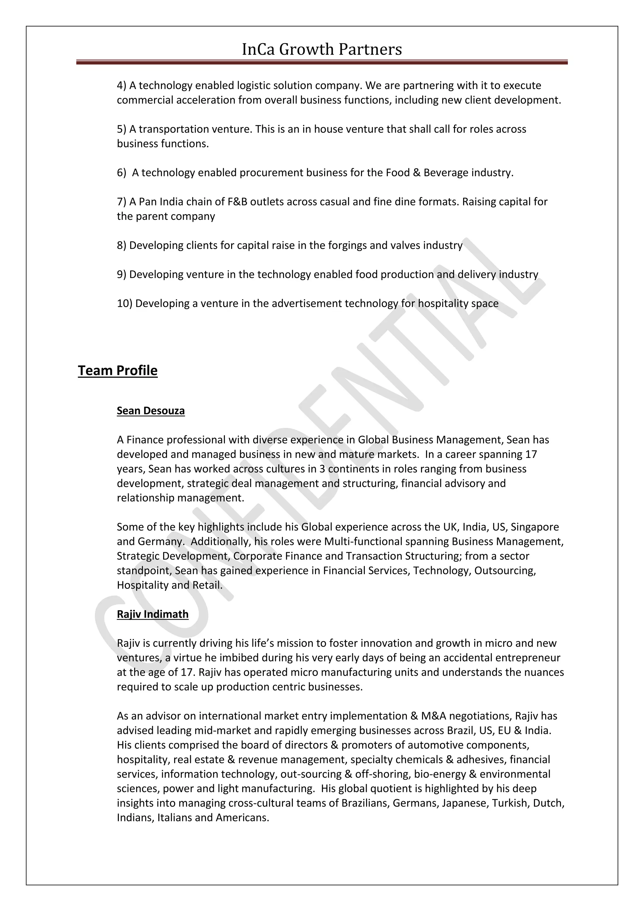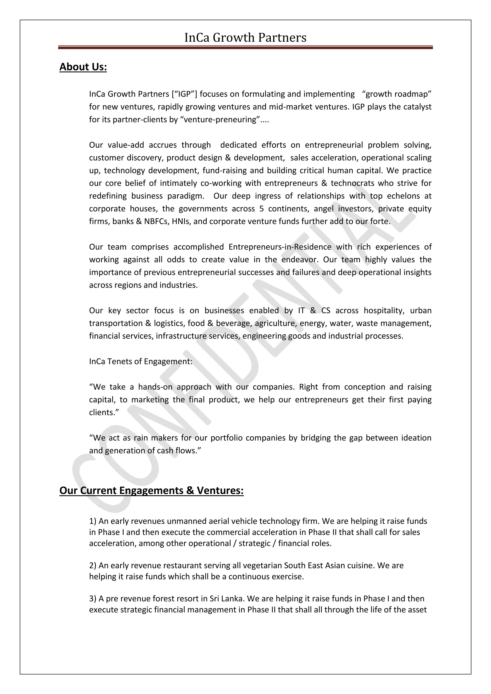 InCa Growth Partners is a venture consulting firm that focuses on formulating growth strategies and providing operational support for startups, growing companies, and mid-market businesses. Their services include entrepreneurial problem-solving, product development, sales acceleration, fundraising support, and building management teams. They have sector expertise in IT, hospitality, transportation, food/beverage, and other industries. Their team of consultants includes experienced entrepreneurs, strategists, and finance professionals with international experience starting and scaling businesses.