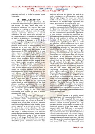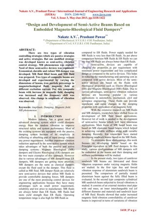 The document discusses the design and development of semi-active beams utilizing magneto-rheological (MR) fluid dampers, which offer enhanced vibration control compared to traditional passive methods. It outlines the advantages of MR dampers, including cost-effectiveness and reliable performance, and presents experimental findings that demonstrate improved vibration dampening by varying magnetic fields in two types of composite MR beams. The results indicate a clear relationship between magnetic field strength and the damping effectiveness, validating the potential of MR fluid-based structures in various engineering applications.