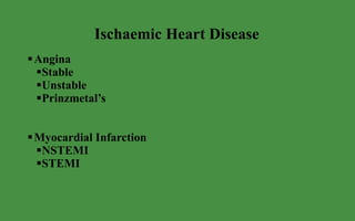 The document discusses ischaemic heart disease and acute coronary syndromes. It describes angina, myocardial infarction, and their management. For stable angina, treatments include nitrates, beta-blockers, calcium channel blockers, and lifestyle modifications. For acute coronary syndromes, management involves oxygen, aspirin, clopidogrel, bed rest, and considering interventions like thrombolysis or angiography. Secondary prevention includes aspirin, beta-blockers, ACE inhibitors, and aggressive risk factor control.